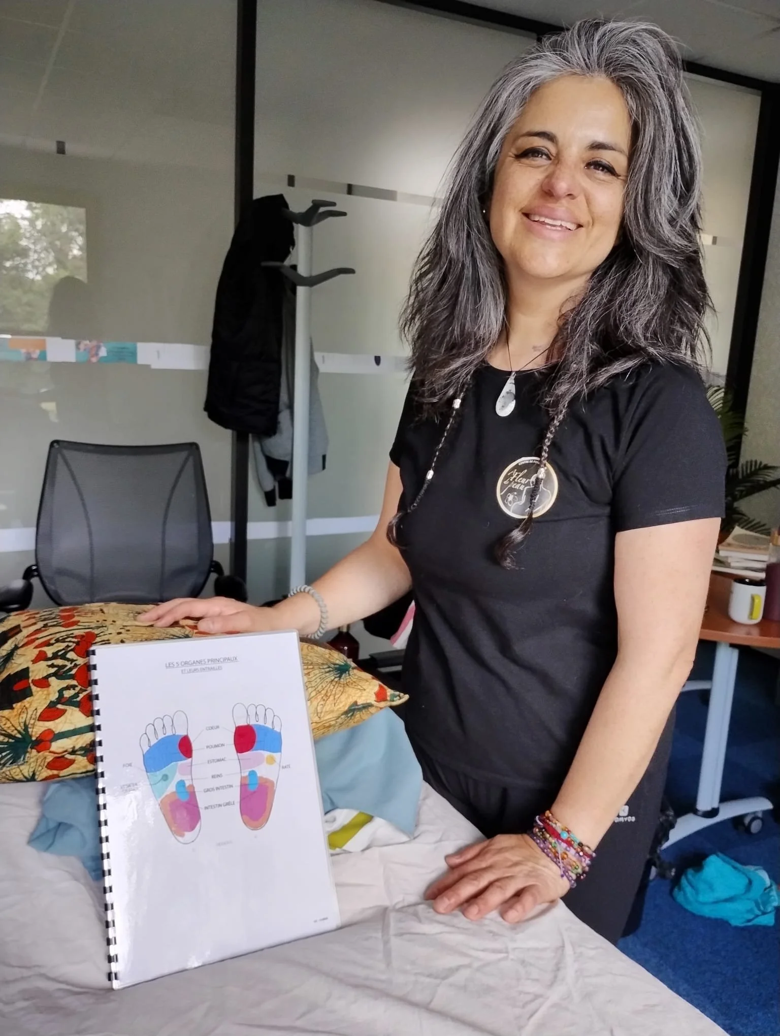 Femme avec cheveux gris, portant un t-shirt noir, se tenant à une table avec un livre illustré sur les organes principaux du corps et un coussin coloré.